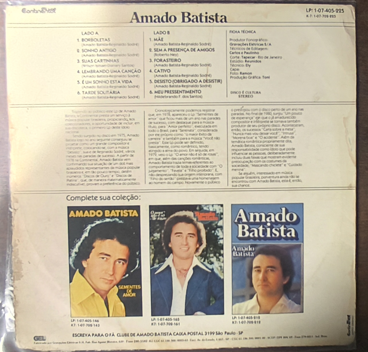 O LP “Amado Batista Canta o Amor“, lançado em 1977 ou 1981 pela Continental, é um marco inicial na carreira de Amado Batista, consolidando seu estilo brega/romântico com 12 faixas, incluindo “Borboletas”, “Mãe” e “Forasteiro”. Este álbum ajudou a desenhar sua identidade musical, unindo baladas românticas e faixas animadas.