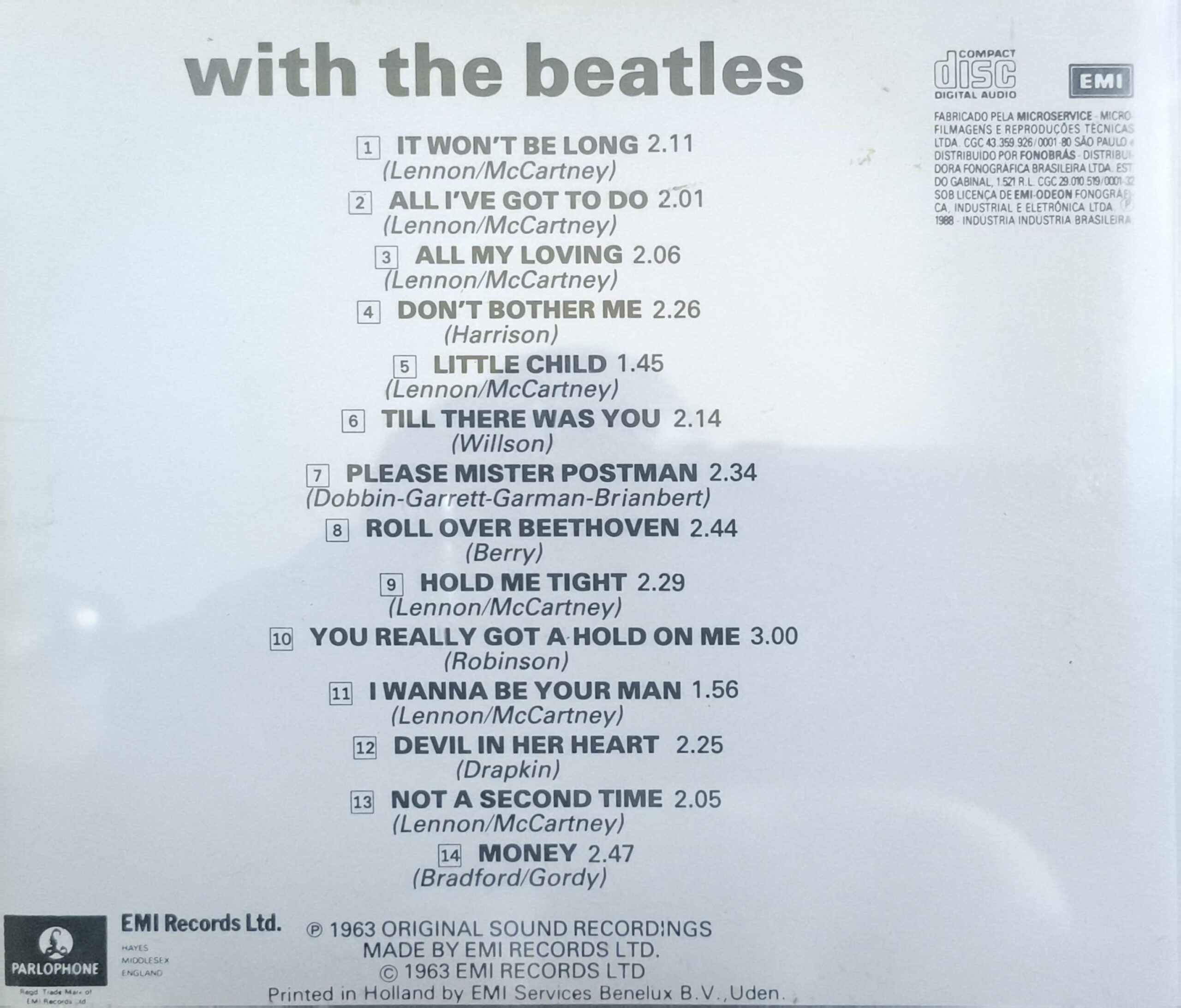 With the Beatles é o segundo álbum de estúdio dos Beatles, lançado em 22 de novembro de 1963 pela Parlophone, consolidando a “Beatlemania” no Reino Unido. Produzido por George Martin, o LP trouxe oito composições autorais e seis covers, destacando a primeira música de George Harrison gravada, “Don’t Bother Me”. A capa icônica de Robert Freeman definiu a estética da banda.
